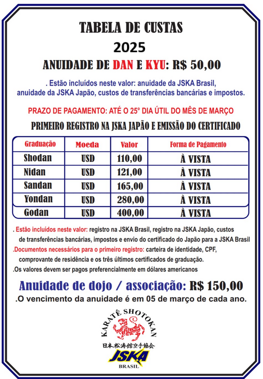 Tabela de Custas Resumida 2025 – (Registros e Anuidades – Individual e DOJO – JSKA Brasil e JSKA Japão – não contempla Exame de Faixa)
